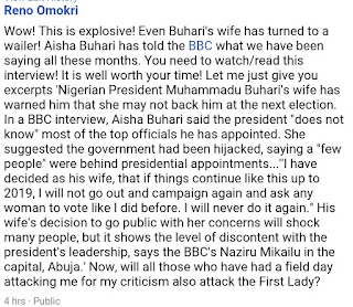 In a BBC Hausa interview, published by BBC Aisha Buhari said the president "does not know" most of the top officials he has appointed. 0She suggested the government had been hijacked, saying a "few people" were behind presidential appointments.